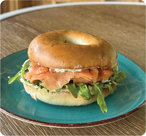 Salmon Bagel with a touch of arugula, pickled onions, and a yummy costeƱo cream.