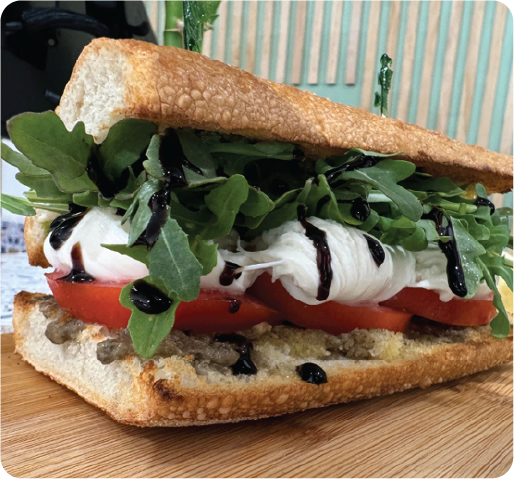 Homemade pesto, olive tapenade, fresh mozzarella, tomato, arugula, and balsamic reduction on ciabatta bread.