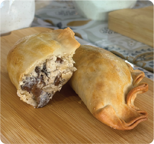 This empanada combines sauteed mushrooms with fine herbs and creamy goat cheese in a golden, crispy dough.