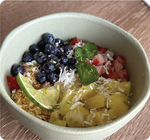 Granola and yogurt topped with blueberry, strawberry, pineapple, line, and coconut.