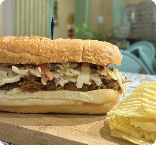 Marinated pulled pork, fresh coleslaw, and homemade BBQ sauce on a soft, toasted bun.