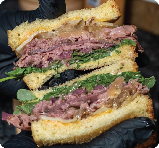 Roast beef, caramalized onions, gouda cheese, and arugula on toasted bread.